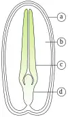 Durante el todo este proceso de formación del embrión, el endosperma pasa del estado de núcleos libres al estado celular y la nucela del óvulo es digerida.