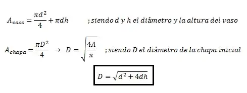 El área de la chapa inicial en el caso del vaso cilíndrico será igual a la suma de las áreas de los elementos geométricos que forman el vaso (círculo del fondo y cilindro de las paredes laterales), por lo tanto:
