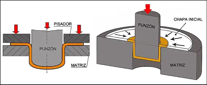 En la embutición de una pieza se parte de una porción de chapa que descansa sobre la matriz, mientras el pisador la mantiene sobre esta y el punzón ejerce la presión necesaria para conformar la pieza provocando la fluencia del material a través de la cavidad abierta en la matriz. La pieza va a conformarse en función de la forma de la abertura de la matriz y la forma del punzón, mientras que el pisador va a evitar el pandeo del material al tratarse de formas generalmente no desarrollables.