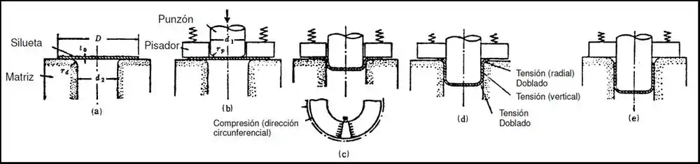 Mientras el punzón aplica la presión en el fondo del vaso, la lámina entre el fondo y la pared del mismo se estira considerablemente. Durante el embutido de la chapa, la silueta exterior de la misma disminuye en diámetro y la zona cercana a esta silueta tiende a incrementar su espesor como consecuencia de las fuerzas de compresión que se generan durante el proceso en esta zona (tendencia a aparecer arrugas por pandeo, fenómeno que evita el pisador).
