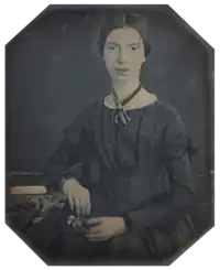 ![]() Daguerrotipo de Emily Dickinson con 16 años, tomada en el seminario de Mount Holyoke entre diciembre de 1846 y principios de 1847. Es la única imagen autentificada de la poeta más allá de su infancia. La fotografía original se encuentra en la sección Archives and Special Collections de Amherst College. | ||