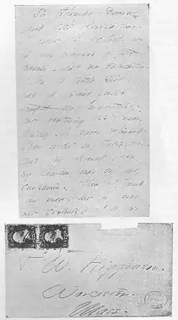 La misiva, fechada el 13 de enero de 1854, está dirigida al reverendo Edward Everett Hale, que en esos tiempos era el pastor de la Iglesia de la Unidad en Worcester: «Pienso, señor, que como usted era el pastor del señor B. F. Newton, que murió hace algún tiempo en Worcester, puede satisfacer mi necesidad de enterarme de si sus últimas horas fueron alegres. Yo lo apreciaba mucho, y me gustaría saber si descansa en paz».