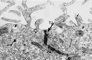 Los Tanicitos β2 de la EM, en sus polos perinucleares del tercer ventrículo, están adosados por uniones intercelulares estrechas. Las uniones tight junction Zonula occludens (TJ) y las Zonula adherens (ZA) conforman la 'barrera al líquido cefalorraquídeo' de la EM (CSF-ME en inglés).[11]