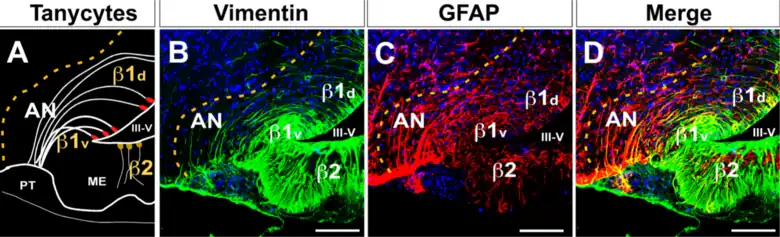 Los polos basales de los β2, tienen prolongaciones citoplasmáticas largas, que entran en contacto directo con los capilares fenestrados desprovistos de barrera hematoencefálica presentes en la EM. Las delgadas extensiones citoplasmáticas de los tanicitos beta-2, también actúan como envoltura de los terminales axonales neurosecretores.[12][9]