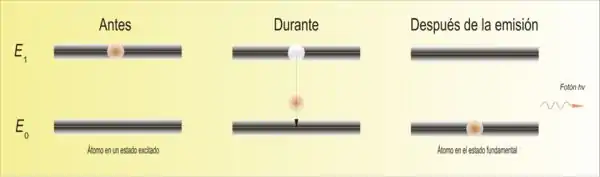 Si el átomo se encuentra en un estado excitado caracterizado por la energía E1, puede decaer espontáneamente al estado fundamental, caracterizado por la energía E0, tras un período muy breve, que dependerá de lo probable que sea el tránsito. En este proceso se emite la diferencia de energías entre los dos estados en forma de fotón. El fotón tendrá una frecuencia ν y una energía hν, es decir: E1 - E0 = hν, donde h es la llamada constante de Planck. La fase del fotón, en la emisión espontánea, es aleatoria al igual que la dirección de propagación de este. En la emisión estimulada no ocurre de la misma forma.