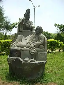 ![]() Estatua de la Consorte Bo, recostada y a punto de tomar la medicina que le ofrece su hijo el emperador, parte de la serie de estatuas inspiradas en Los veinticuatro ejemplos de piedad filial | ||