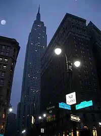 El Empire State Building es un rascacielos situado en la intersección de la Quinta Avenida con la calle 34 Oeste, en la ciudad de Nueva York (Estados Unidos). Su nombre deriva del apodo del Estado de Nueva York. Fue el edificio más alto del mundo durante cuarenta años, desde su finalización en 1931 hasta 1971, año en que se completó la construcción de la torre norte del World Trade Center. Tras la destrucción del World Trade Center el 11 de septiembre de 2001, el Empire State Building se convirtió nuevamente en el edificio más alto de la ciudad de Nueva York y del Estado de Nueva York, hasta que fue otra vez sobrepasado por One World Trade Center el 30 de abril de 2012, quedando el Empire State en segundo lugar.[2] Actualmente, el Empire State es de los rascacielos más emblemáticos e icónicos del mundo por su historia y su gran altura destacable en el siglo pasado. Incluyendo la antena, su altura es de 443 metros (1453,4 pies) convirtiéndolo en el tercer edificio más alto de la ciudad de Nueva York por detrás de One World Trade Center y Central Park Tower.[3]