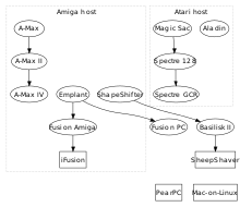 En 1988, el primer emulador de Apple Mac, A-Max, fue lanzado como un dispositivo externo para cualquier Amiga. Necesitaba las ROM de Mac para funcionar, y podía leer discos Mac cuando se usaba con una disquetera Mac (las disqueteras Amiga no pueden leer discos Mac. A diferencia de los discos Amiga, los disquetes Mac giran a velocidades variables, como las unidades CD-ROM). No fue una solución particularmente elegante, pero proporcionó una experiencia Mac asequible y utilizable.
