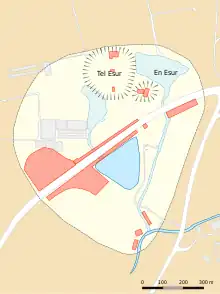 El yacimiento se encuentra en la llanura de Sharón y se extiende al sur del Tell Esur.[4] El yacimiento de En Esur consta de tres elementos: Tell Esur, que es una colina formada por diferentes capas de asentamiento humano acumulado, un montículo más pequeño al sur de este tell y un campo abierto que rodea a este par de montículos, donde durante la Edad del Bronce antigua se extendió una ciudad de gran tamaño.[4]