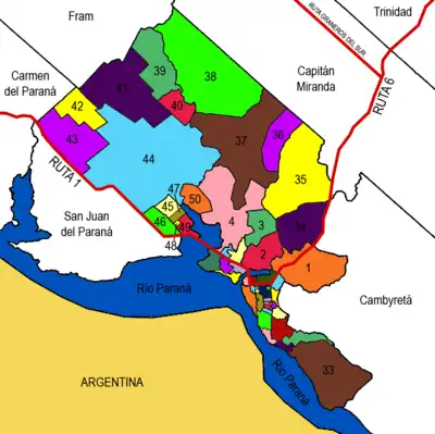 Vista del Municipio de Encarnación dentro del Departamento de Itapúa. (Pulse para ver mapa) | ||||