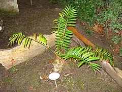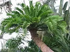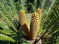 Sus rígidas frondes, como las de las palmas, miden cerca de 1,8 m, con numerosos folíolos rígidos de dientes espinosos. Un ejemplar femenino puede producir conos que parecen piñas alargadas gigantes de 45 cm de longitud.