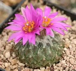 Las flores aparecen en el ápice, entre la lanosidad de las areolas jóvenes. Miden unos 3 cm de diámetro y son de color violáceo.