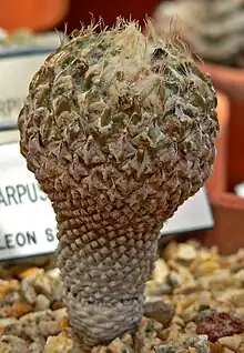 Pelecyphora: nombre genérico que deriva de las palabras griegas: pelekys que significa "hacha" y phoros que significa "tallo" y refleja el aspecto de la planta como de cabezas de hacha.