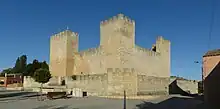 El castillo actual data de finales del siglo XIV y es diferente de la fortaleza original erigida durante la repoblación de Encinas en el siglo IX.[3] Más residencial que marcial, la construcción muestra en sus esquinas los escudos de las familias aristocráticas a las que perteneció: los Zúñiga y los Aguilar.[3] El edificio está construido en sillería y se comenzó a levantar en 1394.[3] De planta cuadrada, tiene torres de igual forma en sus esquinas.[3] La fortaleza cuenta con una barbacana rodeada a su vez por un foso.[3] En el siglo XX, el castillo se utilizó como silo de cereal y perdió así algunos de sus elementos como el puente levadizo, algunas ventanas o dos plantas con columnas del patio de armas.[3]