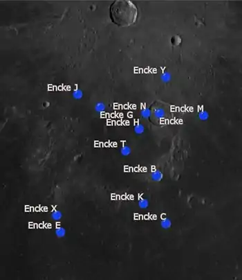 Por convención estos elementos son identificados en los mapas lunares poniendo la letra en el lado del punto medio del cráter que está más cerca de Encke.