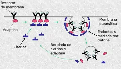 La endocitosis mediada por receptores de carga, se produce cuando los receptores se acumulan en regiones bien definidas de la membrana celular, este mecanismo de transporte permite la entrada selectiva de moléculas en la célula.[15]