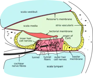![]() Sección de la cóclea. La endolinfa se localiza en la región verde claro del centro del diagrama. | ||