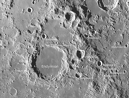 Por convención estos elementos son identificados en los mapas lunares poniendo la letra en el lado del punto medio del cráter que está más cerca de Endymion.