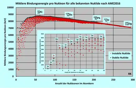 El enlace se crea por la fuerza de atracción de la interacción fuerte entre nucleones vecinos. Esto supera la repulsión de Coulomb mutua de la cargada eléctricamente positiva de los protones en el núcleo. protones del núcleo. La máxima energía de enlace por nucleón se encuentra en Níquel-62[4]. La menor energía de enlace por nucleón fuera de este máximo es fácil de entender: