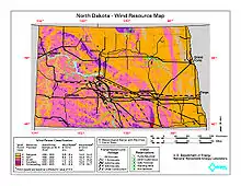 A finales de 2017, se habían instalado 2996 megavatios (MW) de capacidad de generación para energía eólica en Dakota del Norte .[1] La capacidad adicional había estado limitada por las restricciones de la línea de transmisión hasta la finalización de una línea de transmisión desde Fargo hasta el centro de Minnesota en 2015.[2] Otros parques eólicos se planean una vez más para el estado.[3]