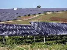 En la década de 1980 y principios de la década de 1990, la mayoría de los módulos fotovoltaicos proporcionaban suministro de energía de área remota , pero desde aproximadamente 1995, los esfuerzos de la industria se han centrado cada vez más en desarrollar edificios fotovoltaicos integrados y centrales eléctricas para aplicaciones conectadas a la red (consulte el artículo sobre centrales fotovoltaicas para más detalles). Actualmente, la planta de energía fotovoltaica más grande de América del Norte es la planta de energía solar de Nellis (15 MW).[41][42] Existe una propuesta para construir una central de energía solar en Victoria, Australia, que sería la central fotovoltaica más grande del mundo, con 154 MW.[43][44] Otras grandes centrales fotovoltaicas incluyen la planta de energía solar Girassol (62 MW),[45] y el Parque Solar Waldpolenz (40 MW).[46]