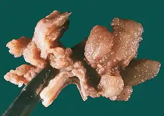 La forma adulta está asociada a una sobreexpresión del gen TGF-α, es cuatro veces más frecuente en hombres que en mujeres, en particular entre las edades de 30 y 60 años.