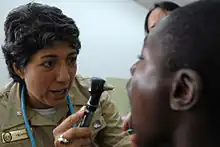 Una enfermera pediátrica inspecciona la garganta de un paciente en la Fundación Dental Juvenil.