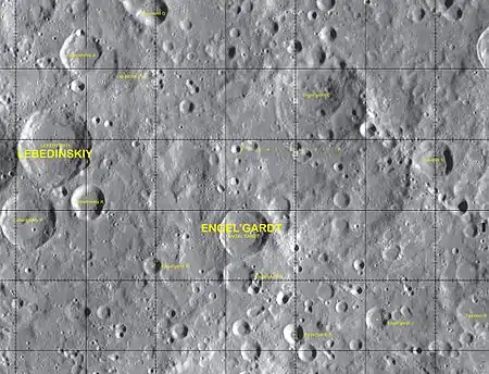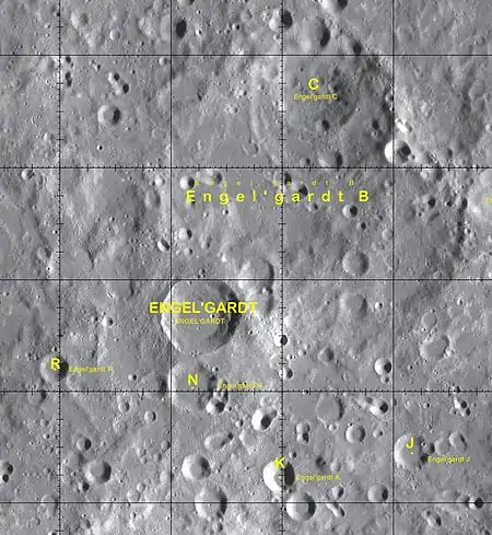 ![]() Localización de Engelʹgardt. Fotografía de la misión Lunar Reconnaissance Orbiter |