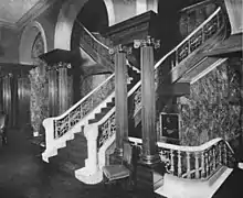 Una gran escalera conduce desde el lado oeste del vestíbulo cerca del centro de la casa.[3][4][34] La escalera tiene montantes tallados, así como un pasamanos con adornos de metal. Se divide en dos patas sobre el vestíbulo, sirviendo a los rellanos del segundo y tercer piso.[3][4] En la escalera estaba colgado un óleo del empresario Andrew Carnegie, que financió parte de la construcción.[36] El rellano del tercer piso tiene un techo de yeso, una claraboya ovalada de vidrio coloreado y paredes de madera.[3][39] El lucernario de 18 m de altura ilumina el vestíbulo.[3]