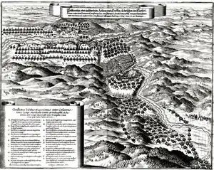 Turena tomó después el castillo de Kreuznach, tras lo cual cruzó el Rin y se internó en Alemania hasta las cercanías de Núremberg, en Mergentheim. Turena pensaba que las tropas enemigas estaban lejos y diseminadas, por lo que dispersó las suyas para que buscasen forraje. Sin embargo, el ejército de Mercy se encontraba cerca y el 2 de mayo de 1645 pudo derrotar a Turena en la batalla de Mergentheim, en la que Turena perdió las cinco sextas partes de sus tropas incluyendo 1.200 jinetes, toda la artillería y bagajes.[3]