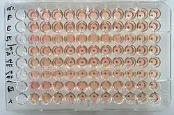 A continuación, se añade una cantidad estandarizada de eritrocitos a cada pocillo y se le permite la incubación a temperatura ambiente durante 30 minutos más. Las imágenes de la placa HI resultantes suelen evolucionar desde no aglutinadas, con los pocillos «botón» con elevada concentración de anticuerpos, hasta aglutinadas, con los pocillos rojos difusos con baja concentración de anticuerpos. El valor del título de HI es el inverso de la última dilución de suero que inhibió completamente la hemaglutinación.[7]