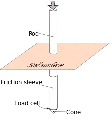 El método de prueba consiste en empujar un cono instrumentado, con la punta hacia abajo, hacia el suelo a una velocidad controlada de 1,5-2,5 cm/s. La resolución del CPT al delinear capas estratigráficas está relacionada con el tamaño de la punta del cono, con puntas de cono típicas que tienen un área de sección transversal de 10 o 15 cm², que corresponde a diámetros de 3,6 y 4,4 cm. Se desarrolló muy temprano un penetrómetro de substracción ultraminiatura de 1 cm² y se usó en un programa de diseño de suelo / estructura de sistema de lanzamiento de misiles balísticos móvil de los EE. UU. (MGM-134 Midgetman) en 1984 en la Earth Technology Corporation de Long Beach, California.