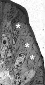 Los enterocitos son las células absortivas del intestino, tienen dimensiones de 20-25 µm de altura y 7-8 µm de ancho y se caracterizan por su chapa estriada apical. [1]