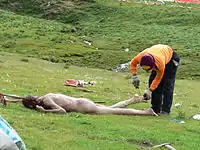 La mayoría de los tibetanos adhieren al budismo, que predica la Reencarnación. No hay necesidad de preservar el cuerpo ya que, según sus creencias, es un contenedor vacío. La naturaleza puede descomponerlo o las aves pueden consumirlo, por lo que la función del ritual es simplemente el desecho de los restos. En el Tíbet el suelo es demasiado duro y rocoso para cavar una tumba, por lo cual esta práctica es generalmente preferida a la cremación.