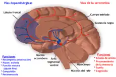 Como parte de la vía de recompensa, la dopamina se fabrica en los cuerpos de las células nerviosas ubicadas dentro del VTA y se libera en el núcleo accumbens y la corteza prefrontal . Las funciones motoras de la dopamina están vinculadas a una vía separada, con cuerpos celulares en la sustancia negra que fabrican y liberan dopamina en el cuerpo estriado.