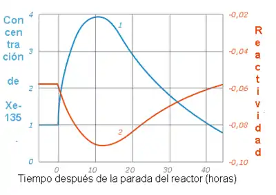 Los cambios de concentración de 135Xe en el núcleo del reactor después de su apagado están determinados por la historia de la potencia a corto plazo del reactor (que determina las concentraciones iniciales de 135I y 135Xe), y luego por las diferencias en el periodo de semidesintegración de los isótopos, lo cual regula las tasas de su producción y eliminación. Si la actividad de 135I es mayor que la actividad de 135Xe, la concentración de 135Xe subirá, y viceversa.
