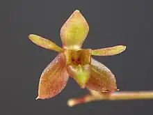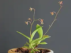 Es una orquídea epífita; como un tamaño pequeño, que prefiere el clima caliente. Tiene tallos basalmente teretes, y comprimidos por encima envueltos completamente por vainas y que lleva 3 a 4 hojas elípticas, basalmente conduplicadas, agudo-acuminadas que se orientan en el mismo plano y florece en la naturaleza en el invierno y principios de primavera en una inflorescencia terminal, erecta y luego arqueada, laxamente paniculada.[1]