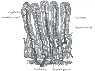 En el intestino delgado, la capa mucosa está adaptada para proporcionar una extensa área superficial, con el fin de exponer los contenidos luminales a las células absortivas. La ampliación de la superficie de absorción, más allá de un simple cilindro de intestino, se consigue mediante tres factores anatómicos:[2]