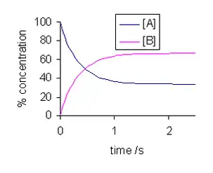 donde es la constante de velocidad para la reacción hacia adelante y es la constante de velocidad para la reacción hacia atrás y los corchetes, [..] denotan concentración. Si solo está presente A al tiempo t = 0, con una concentración , la suma de las dos concentraciones, y , en el tiempo t, será igual a .