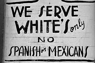 Las costumbres locales separaron intencionalmente a los estudiantes mexicano-estadounidenses de los estudiantes anglosajones.[12] Aunque clasificados legalmente como parte de la raza "blanca", los mexicano-estadounidenses eran percibidos socialmente como "de color" y sujetos a segregación en escuelas y comunidades, independientemente de su raza.[12][13] El caso de 1946 Méndez v. Westminster encontró que la segregación de estudiantes chicanos era ilegal en California.