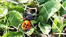 Esta especie presenta un dimorfismo sexual notable. El macho mide entre 8 y 10 mm y posee un prosoma negro y un opistosoma de un llamativo color rojo con puntos negros. Sus patas son negras con líneas blancas y las patas traseras tienen algo de rojo. La hembra mide entre 10 y 16 mm y es negra, con algunos pelos blancos y algunos amarillos en el frente.