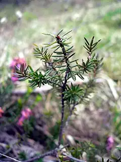 Es un pequeño arbusto de crecimiento lento, que alcanza de 10 a 25 cm de alto, perennifolio con hojas aciculares de 4 a 8 milímetros de largo, que se presentan en espirales de cuatro. Las flores se producen en racimos a finales del invierno o a inicios de la primavera, a menudo comenzando a florecer mientras que la planta todavía está cubierta de nieve; la flor individual tiene forma de campana, de 4 a 6 milímetros de largo, de color rojizo a rosado oscuro, raramente blanco.