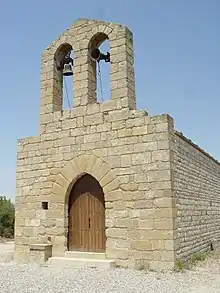 La única puerta que posee está situada en el muro del pie, es decir, a poniente; es de medio punto, cabeza y altura y obrada con buenas dovelas de piedra. La fachada está coronada por un esbelto campanario en espadaña.[3]