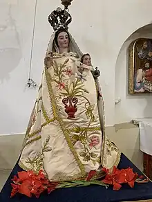 La Virgen, coronada, con velo de caída lisa a ambos lados de su rostro, muy natural, se cubre por un manto amplio que, bajando sobre el hombro izquierdo, deja a la vista el derecho y cae en gruesos pliegues sobre las rodillas de la imagen. María, con su mano izquierda, sujeta al Niño, sentado casi al centro de las rodillas de su Madre, de cara al pueblo al que bendice; la Virgen ofrece a su Hijo una flor con su mano derecha. Debajo de la imagen una nota, escrita en la peana, dice: "Rda. Año 1930. Vitoria".[1]