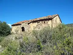 Vista fronto-lateral derecha de la ermita de San Pedro en El Cuervo (Teruel).