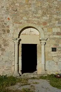 La puerta de acceso al templo está en la fachada de poniente (fachada de los pies). Tiene arco de medio punto que descansa sobre los cimacios de las columnas.