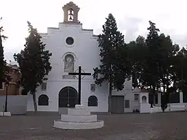 Además, en el recinto existen otros casilicios con diferentes advocaciones marianas y santos, con oraciones en verso dedicados por vecinos del pueblo.[1] La ermita, con advocación a la Divina Pastora, se encuentra tras la plaza, y en el eje de la misma. Se podría datar entre 1798 y 1853, tratándose de una construcción de una sola nave con tres capillas a cada lado. La cubierta de la nave forma una bóveda de cañón, que se divide en cuatro tramos separados por arcos fajones que se sujetan en pilares jónicos. Tiene coro a los pies, y bajo el mismo, una inscripción que fecha su pintura y decoración en el año 1884.[2] La imagen de la Divina Pastora se conserva en un nicho en el abigarrado y policromado retablo del altar mayor, tras el cual se halla la sacristía. La bóveda está decorada con pinturas ilusionistas de lunetos con ventanas enmarcadas por arquitectura. El altar mayor es de estilo neoclásico, con bóveda acabada en una cúpula asentada en un elevado tambor con cuatro falsas pechinas que representan atributos de la Virgen. Por último, a la derecha de la ermita está lo que debía ser las dependencias del ermitaño. La fachada principal tiene tres arcos de medio punto, siendo el central de mayor dimensión y presentando un nicho que aunque antiguamente ubicó una imagen de la titular, actualmente solo tiene un panel con la imagen de la Divina Pastora en azulejos cerámicos, del año 1983[2] y sobre él una ventana circular u óculo. La fachada tiene como remate una cornisa en forma escalonada ascendente que termina en el centro con una pequeña espadaña de ladrillo con una campana. A ambos lados de la fachada hay dos pirámides.[1]
