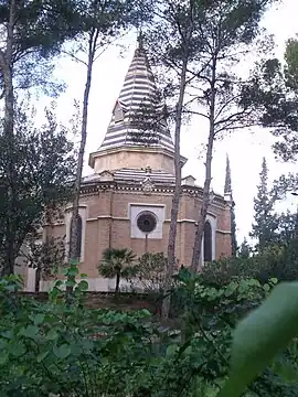 Respecto al Panteón de Dos Aguas, se encuentra junto a la ermita y que se comunica con ella a través de una reja de hierro. Tiene planta octogonal, con un espacio central (permite ver la cripta), cubierto con una cúpula decorada con pinturas y sostenida por arcos apuntados apoyados en pilastras de mármol, que está rodeado por una nave o galería que recorre el edificio. Esta galería tiene como techo una bóveda de crucería con nervios que recaen sobre columnas adosadas al muro, en el cual se abren vanos con vidrieras para dar luz al interior. A la cripta se accede a través de una escalera hecha con grandes losas de piedra, y recibe la luz a través de la abertura circular superior, protegida por una barandilla de mármol italiano, que da a la parte central del panteón. Los materiales empleados en la construcción son el ladrillo sobre zócalo de piedra. Exteriormente está acabada en ladrillo cara vista, destacando el acabado de los vanos y la cornisa que recorre todo el edificio, en el que utiliza otro material, jugando con los colores de los mismos. La cubierta tiene dos cuerpos de diferente pendiente, el más alto es un chapitel con buhardillas, decorado con tejas de cerámica combinando el blanco y el azul formando franjas horizontales con dibujos geométricos.[1]