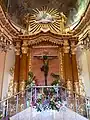 La decoración del interior es de estilo rococó, con rocallas del siglo XVIII, y lienzos de José y Vicente Cotanda. La cúpula y las pechinas están decoradas con pinturas de la Pasión. En la remodelación de 1975 se añadió una girola tras el camarín. La imagen de Cristo es una talla del XVII atribuida a la escuela sevillana de Juan Martínez Montañés. Preside el altar mayor un retablo con columnas y profusión de mármoles y dorados.[1]