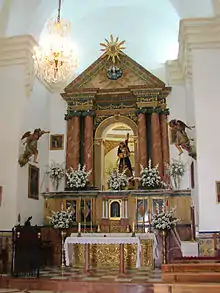 El altar mayor se encuentra cubierto por un retablo de tipo clásico, con columnas jónicas, rematado por un frontón. Colocada en alto detrás del altar mayor existe una pequeña capilla, el Camarín, para exposiciones de la imagen de Nuestro Padre Jesús del Calvario, de forma que ésta es visible a través del centro del retablo. El Camarín existe con estas características en iglesias españolas, el primer ejemplo que encontramos es el de la iglesia de Los Desamparados de Valencia. Frente al altar mayor y encima de la entrada está situado el coro, sostenido por un gran arco carpanel y en sus laterales por ménsulas de formas mixtilíneas de conchas.